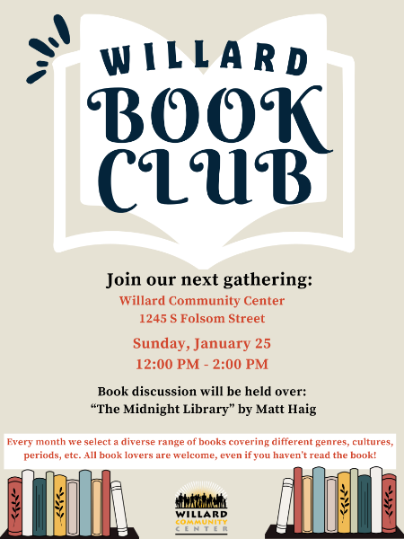 Willard Community Center’s Book Club is welcoming readers of all kinds to its next monthly gathering on Sunday, January 25, from 12:00–2:00 PM, at Willard Community Center, 1245 S. Folsom Street. Whether you’re an avid reader or simply enjoy thoughtful conversation, this inclusive group offers a relaxed space to connect through literature.
