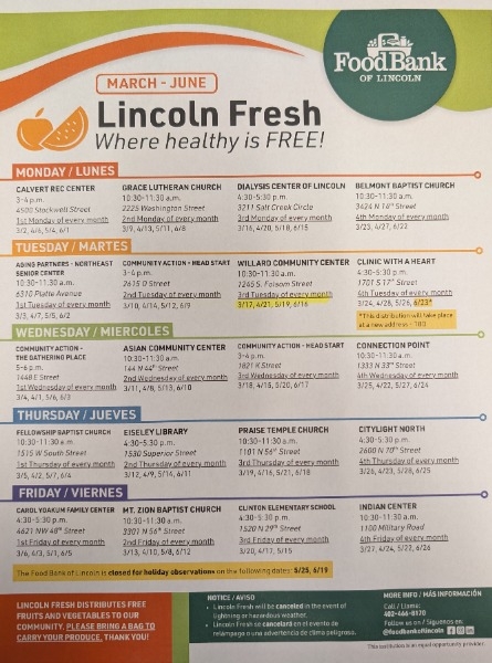 Lincoln Fress Program through the Food Bank of Lincoln will resume handing out fresh fruits and vegetables in front of Willard beginning Tuesday, March 12, 2024, through the middle of June. Open and free to the public! Bring your . . .