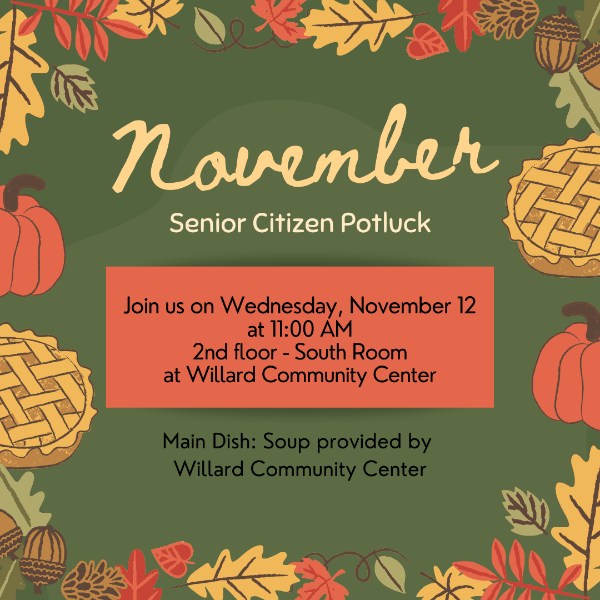 Join us for our next Aging Adult & Senior Potluck on Wednesday, November 12, 11:00 AM–12:00 PM at Willard Community Center. We’ll provide a warm, hearty soup as the main dish. Please bring a side, salad, or dessert to share, . . .
