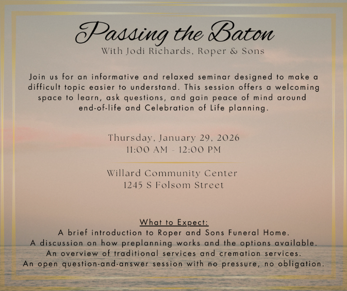 Presented by Jodi Richards from Roper and Sons Funeral Home Thursday, January 29 | 11:00 AM – 12:00 PM Willard Community Center Join us for a relaxed and informative presentation designed to make a difficult topic more . . .